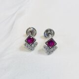 These exquisite earrings, crafted from 92.5 sterling silver, feature a captivating geometric design. Each earring showcases a vibrant square-cut ruby-red stone set in a sleek silver frame, creating a striking focal point. Below the central gem, a cluster of shimmering stones forms a secondary square, adding a touch of elegance and sparkle. Perfect for both formal and casual occasions, these earrings combine bold color with timeless style, making them a versatile and sophisticated addition to any jewelry collection.