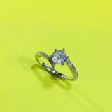 Elegantly crafted in 92.5 sterling silver, this exquisite ring features a dazzling central solitaire stone, securely held by six delicate prongs. The band is adorned with shimmering pave-set stones that enhance the brilliance of the centerpiece, creating a breathtaking sparkle from every angle. With its timeless design and flawless finish, this ring offers the perfect blend of sophistication and modern glamour, making it a captivating choice for engagements, special occasions, or as a statement of refined taste.